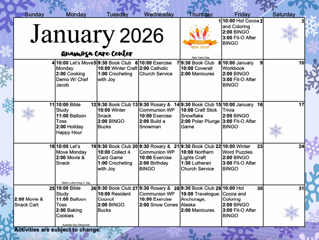 Anamosa Care Center Activity Calendar- January 2026