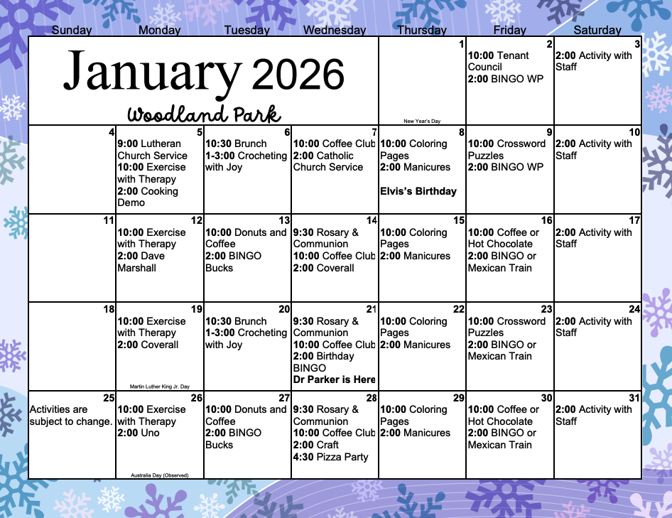 Woodland Park Assisted Living Activity Calendar- January 2026